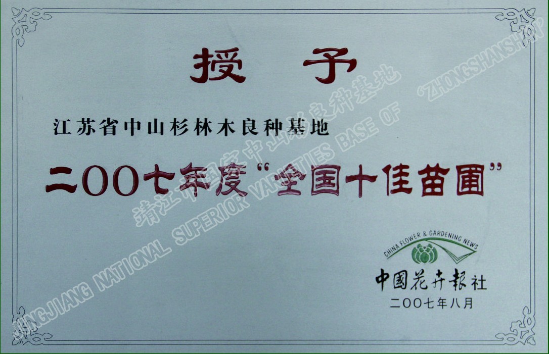 靖江市中山杉林木良種有限公司單位現有職工120人,其中中高級技術人員26人,初級技術人員45人,高級技工45多人,備有多功能灑水車、高空作業車、挖掘機、草坪噴播機等齊全的園林施工機械,年承接綠化工程100萬平方米以上。公司自成立以來,參與了眾多省內外綠化重點工程的建設,先后完成江陰長江公路大橋、潤揚大橋、南京三橋、蘇州吳中大道、揚州西北線繞城、無錫沿江高速、無錫342省道、滬寧高速、泰高路、寧通高......